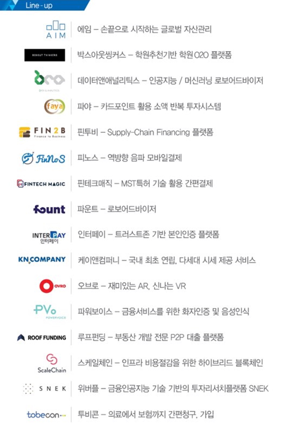 행사에는 신한 퓨처스랩 1, 2기에 참여한 스타트업 23개사가 참여했으며, 이 중 2기 스타트업 16개사가 데모데이 무대에 올라 IR 피칭을 진행했다. 인증, 보안, 결제, 자산관리 등 핀테크의 다양한 세부 분야 스타트업이 참석했다. 더불어 핀테크와 연계할 수 있는 VR/AR/O2O 분야의 스타트업도 참여해 자리를 빛냈다.