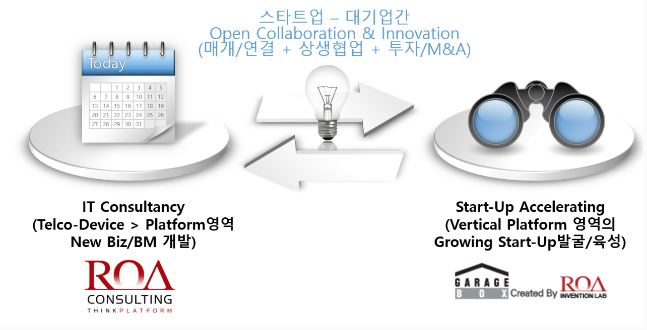 로아컨설팅은 이러한 시대적 흐름에 컨설팅 기관으로서는 처음으로 자회사인 로아인벤션랩(ROA Invention LAB)을 설립하고, 이 자회사를 중심으로 스타트업 전문 액셀러레이팅을 수행하는 개라지박스(garagebox, www.garagebox.biz)를 3년 동안 운영해 오고 있다. 그리고 국내 모 대기업(제조사)의 인재개발원과 공동으로 임원 대상의 오픈 이노베이션 데이(Open Innovation Day)도 2년 간 정기적으로 개최하는 데 참여하면서 스타트업 조직과 대기업 조직을 연결/매개하는 인포미디어리(Infomediary)의 역할을 수행하고 있다.