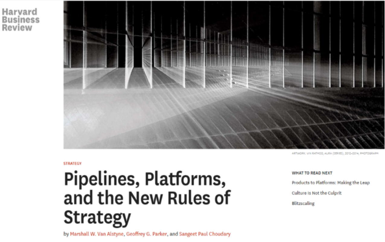 이에 대한 단초로 2016년 4월 HBR의 핵심 페이퍼로 플랫폼 전략론의 대가인 마샬 반 알스타인(Marshall Van Alstyne)외 2명의 교수가 기고한 ‘Pipeline, Platforms, and the New Rules of Strategy’논문을 살펴볼 필요가 있다.
