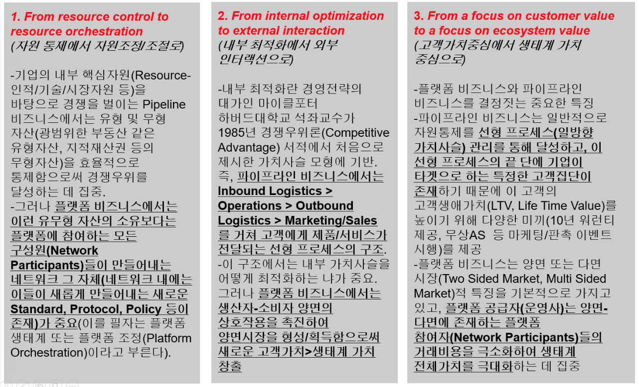 플랫폼 비즈니스 모델의 가장 큰 특징은 자원 조정/조절 중심 – 외부 인터랙션 중심 – 생태계 가치 중심으로 완전히 드라마틱하게 전환된다는 점이다.