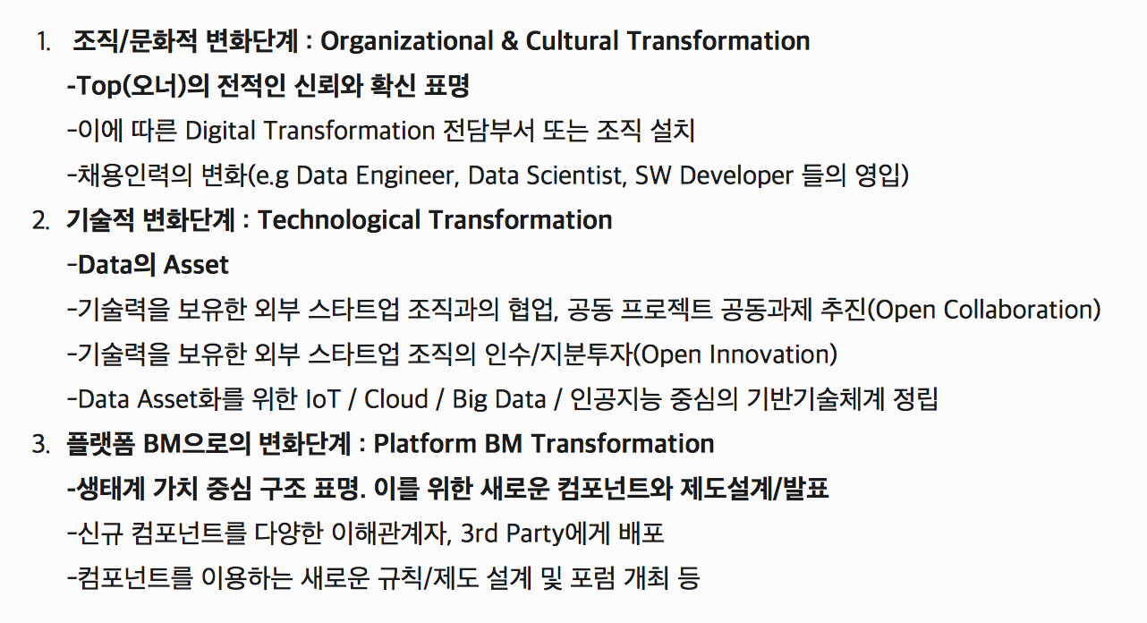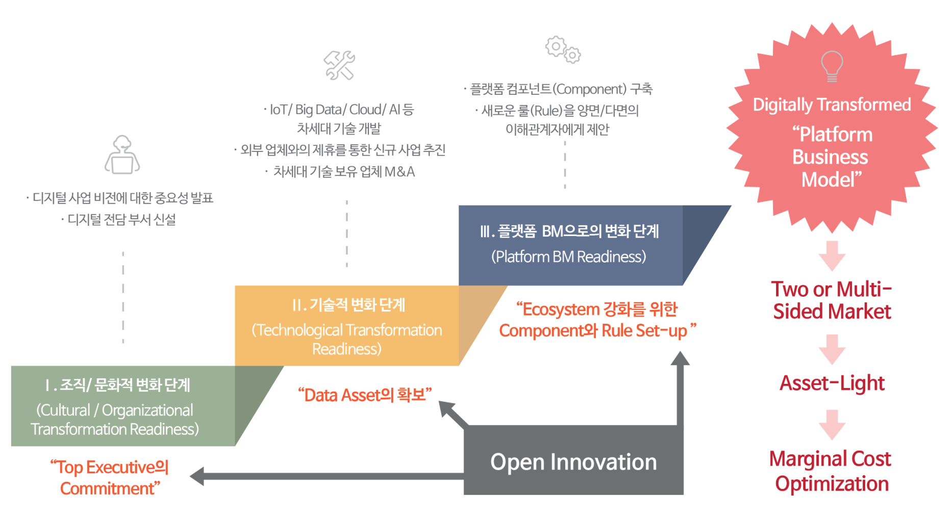 특히, 고객(소비자 / 기업) 데이터의 자산화, 현재 기업, 공장 등 기업 내부 곳곳에서 관리되고 측정되어야 할 데이터의 자산화(Asset Light)를 통해 신규 시설과 원천기술투자 중심(Asset Heavy)에서 고객과 현장 데이터 중심의 사업아이템 발굴과 즉각적인 실행(Lean, Agile Approach)이 가능한 조직(Asset Light)으로 변환되어야 한다.
