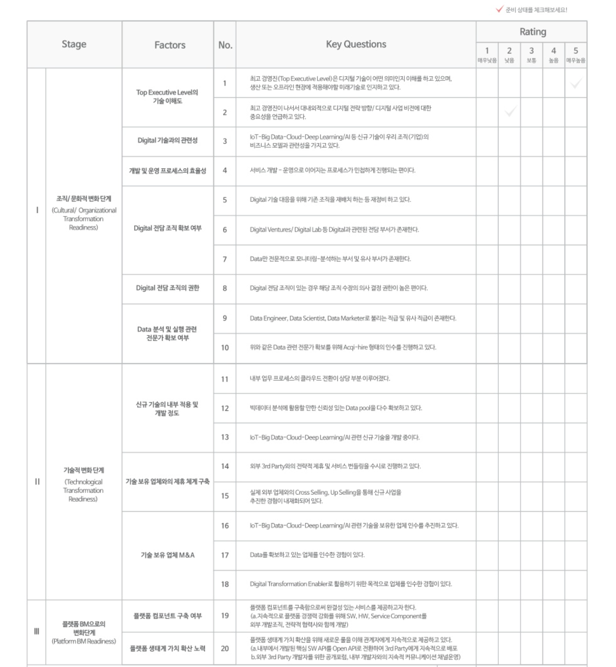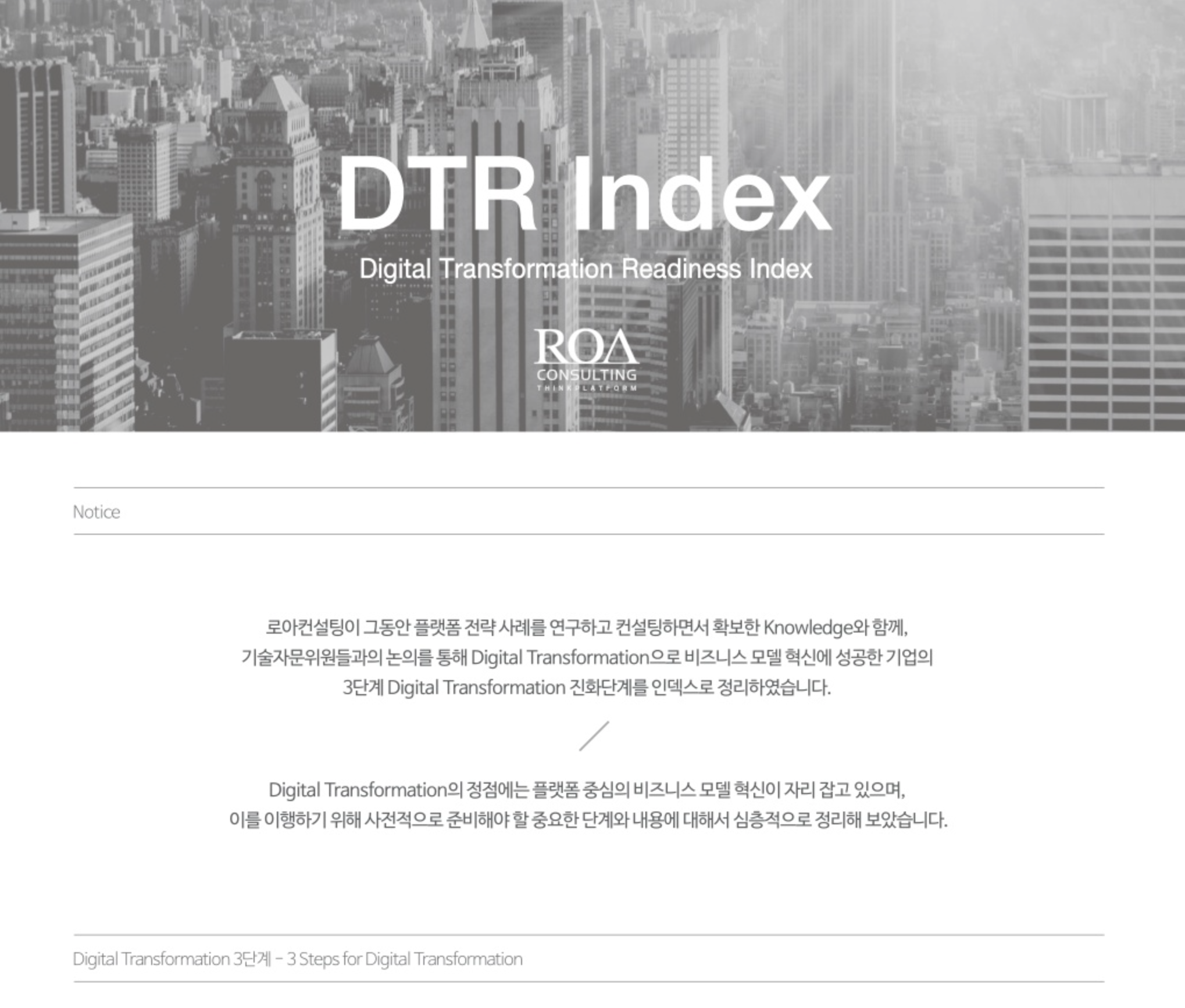로아컨설팅이 특별히 제작한 국내 대기업/중견기업을 위한 [Digital Transformation 준비점검표]를 소개한다. Digital Transformation Readiness Index(DTR Index) 로 명명한 이 준비상태 점검표를 통해 현재 우리 기업이 플랫폼 비즈니스 모델로 전환하기 위해 어느 정도의 준비가 되어 있는지 가늠할 수 있게 제작이 되었다. 물론 글로벌 사례연구를 통해 3단계의 Approach가 중요하다는 점에 착안하여, 각 단계 별로 반드시 고려해야 할 구성요인을 질문 형태로 정리하여 리커트 척도 5점을 기준으로 기업 내 경영진들이 스스로 판단할 수 있도록 설계되었다.