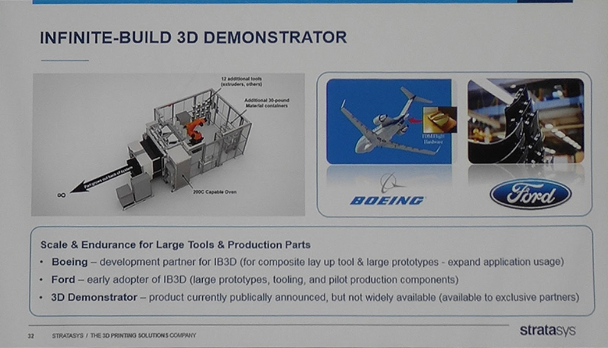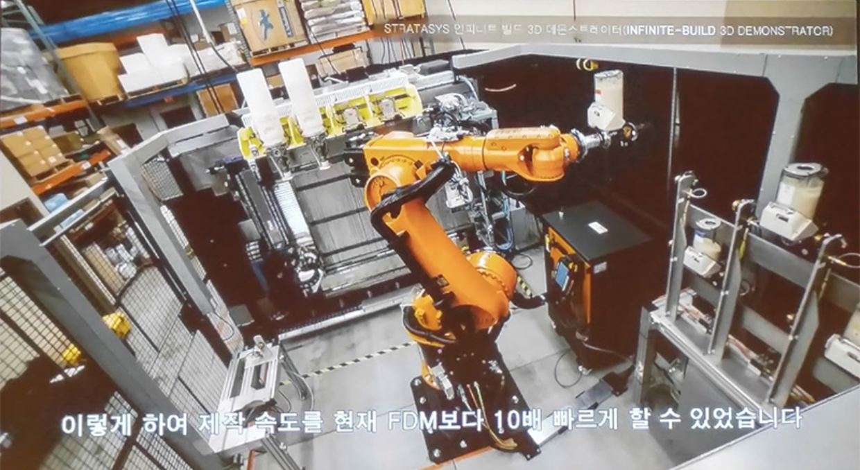스트라타시스는 현재 연구 중인 3D 프린팅 신기술도 소개했다. 스트라타시스가 선택한 것은 산업용 로봇 암에 3D 프린팅 기술을 결합한 것이다. 대표적인 것이 인피니트 빌드(인피니트-빌드 3D 데몬스트레이터)와 로보틱 컴포지트(로보틱-컴포지트 3D 데몬스트레이터)다. 인피니트 빌드는 Z축으로(아래에서 위로) 물건을 제작하는 기존 3D 프린터와 달리 Y축으로 물건을 제작할 수 있다. 쉽게 말해 기존 3D 프린터를 옆으로 눕힌 개념이다. Z축 방향으로 제작할 경우 3D 프린터의 헤드가 높이 올라가지 않는 한 제작할 수 있는 크기가 한정돼 있지만, Y축의 경우 트레이를 계속 이동시키면 되기 때문에 대형 부품 제작에 어울린다. 보잉은 현재 제조 공정 일부에 이를 시험하고 있다. 또한, 산업용 로봇 암을 통해 재료가 떨어지거나 다른 재료로 바꿔야 할 경우 이 로봇 암이 자동으로 이런 작업을 거치기 때문에 관리자의 작업도 줄어든다.’’’