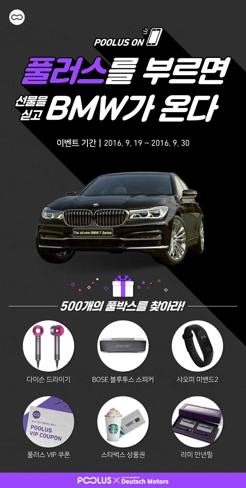 이번 프로모션 기간 동안 카풀 여정을 신청한 라이더는 랜덤 매칭을 통해 BMW7시리즈를 비롯한 BMW 차량에 매칭되어 무료로 카풀을 이용할 수 있다. 또한 BMW 차량 트렁크에 실린 깜짝 선물 상자 중 하나를 즉석에서 받게 된다. 선물 상자에는 다이슨 헤어드라이어, BOSE 블루투스 스피커, 스타벅스 상품권, 풀러스 무료이용권 등이 들어 있다.