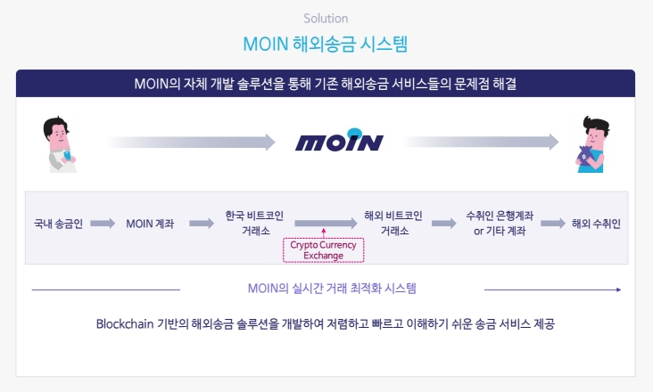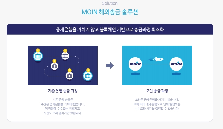 서일석 모인 대표는 “모인이 이와 같은 서비스를 선보일 수 있는 데에는 기존 해외송금 시스템인 SWIFT 망을 이용하는 대신 “블록체인’ 기술을 적용했기 때문”이라며 “SWIFT 망을 사용하면 중계은행을 거치기 때문에 송금 시간과 비용이 높아지기 때문에 모인은 블록체인 기술을 활용하여 이러한 문제점을 해결했다”고 전했다.