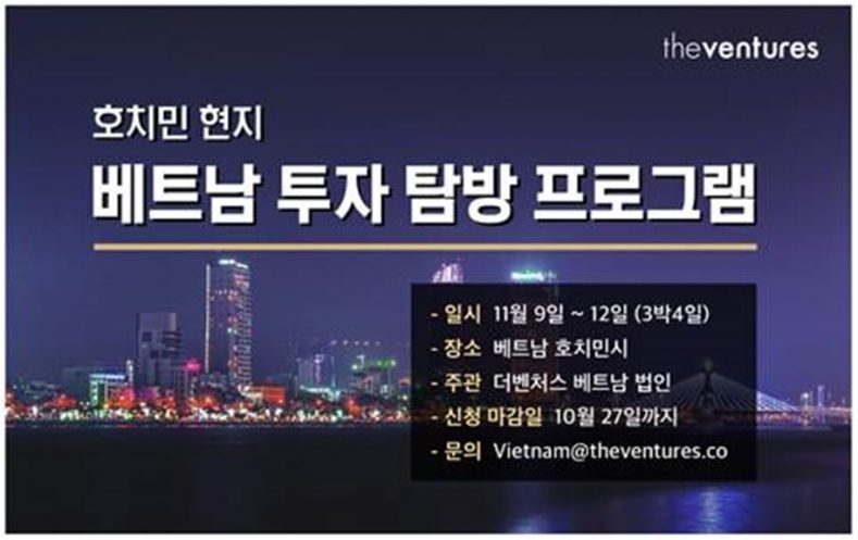 더벤처스가 11월 9일부터 12일까지 3박 4일간 ‘제1회 베트남 투자 탐방 프로그램’을 개최하고, 10월 27일까지 참가자를 모집한다고 밝혔다.