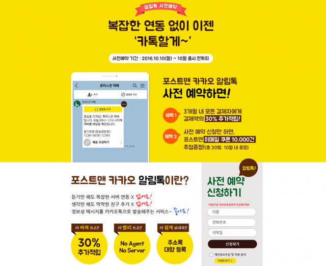 디지털 마케팅 기업 ‘휴머스온’이 ‘포스트맨 카카오 알림톡 웹 서비스’를 출시하고, 사전 예약 이벤트를 진행한다고 밝혔다. 카카오 알림톡은 별도의 친구 추가 없이 정보성 메시지를 카카오톡으로 보내는 서비스다.