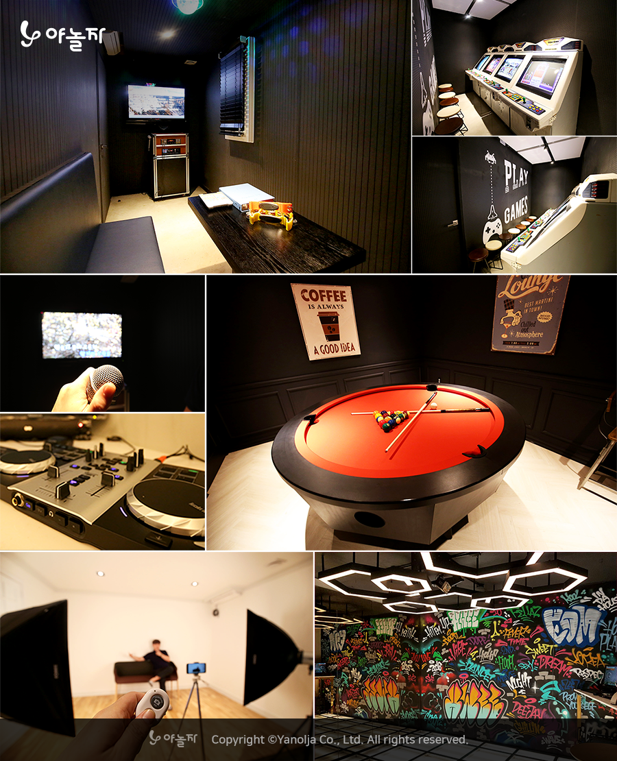 플레이존은 디제잉 및 파티를 진행할 수 있는 공간과 노래방, 당구장, 각종 게임, 사진 촬영 스튜디오로 구성되어 있다.