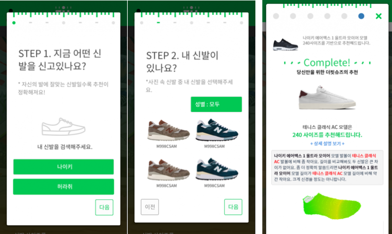 이런 불편함을 해소하기 위해 만들어진 더핏은 온라인 쇼핑몰에서 제품을 구매하기 전 자신에게 알맞은 사이즈를 추천해 주는 서비스이다. 구매 전 사이즈를 꼭 재야 하는 제품이라면 모두 이용될 수 있는 서비스지만, 현재 더핏이 집중하고 있는 제품군은 신발이다. 신발은 같은 브랜드라도 라인에 따라 미묘한 사이즈 차이가 있고, 발볼 크기에도 영향을 많이 받는다. 그래서 온라인에서 신발을 구매할 때는 정확한 발 사이즈 정보가 무엇보다 중요하다.