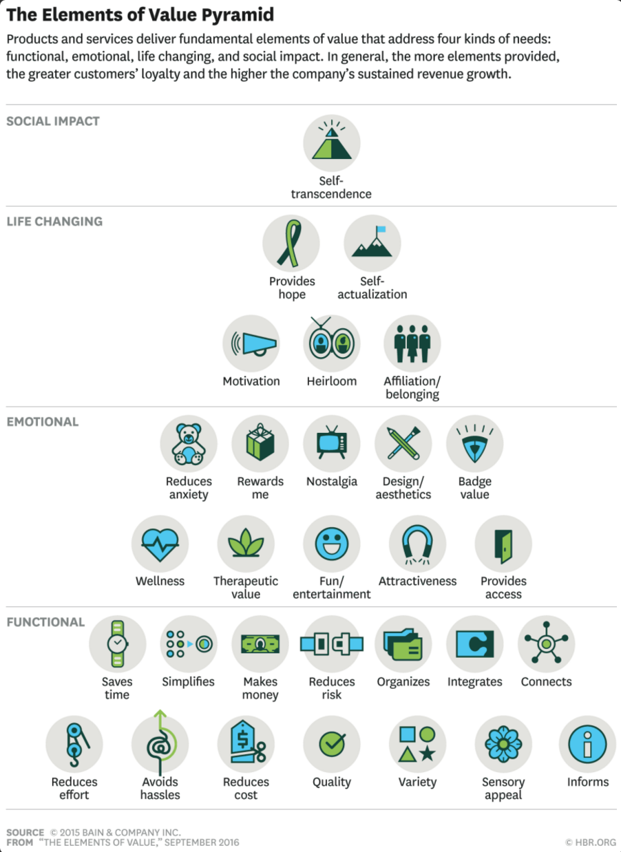 가치에 대한 고민과 사용자로서 고객에 대한 고민이 겹치면서 매슬로의 욕구 단계설까지 들여다보기도 한다. 이와 관련하여 최근에 Harvard Business Review에 흥미로운 논문 The Elements of Value 가 나왔다.