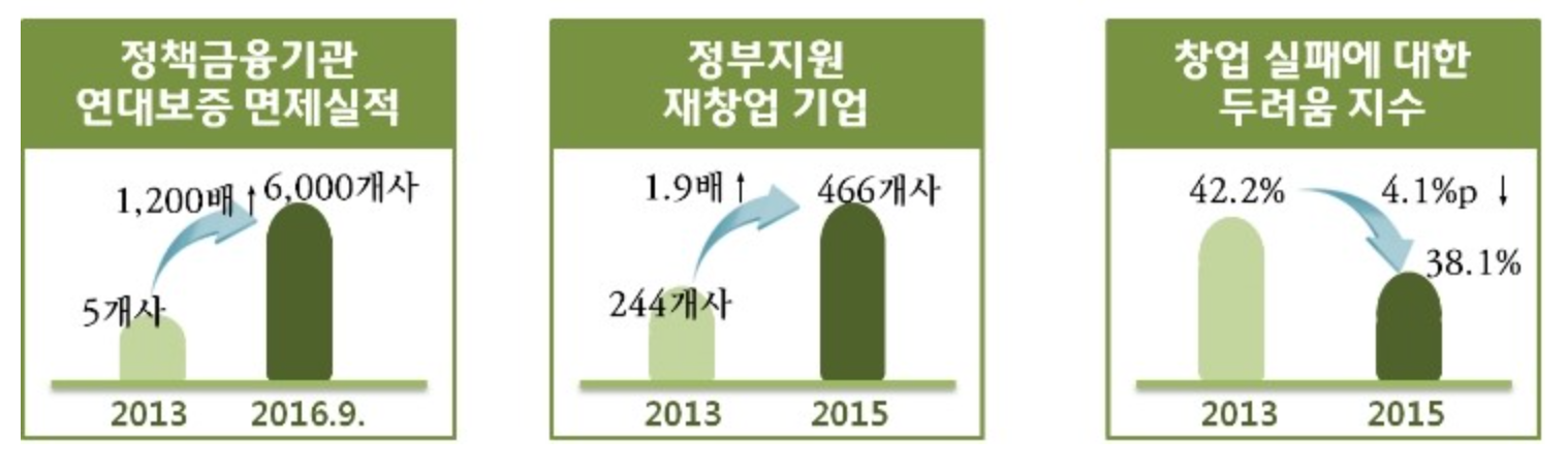 또한, 실패기업인에 대한 사회적 편견 해소와 재도전 분위기 확산을 위해 미래창조과학부와 중소기업청, 시중 금융기관이 공동으로 재도전 인식 개선을 추진하였습니다.