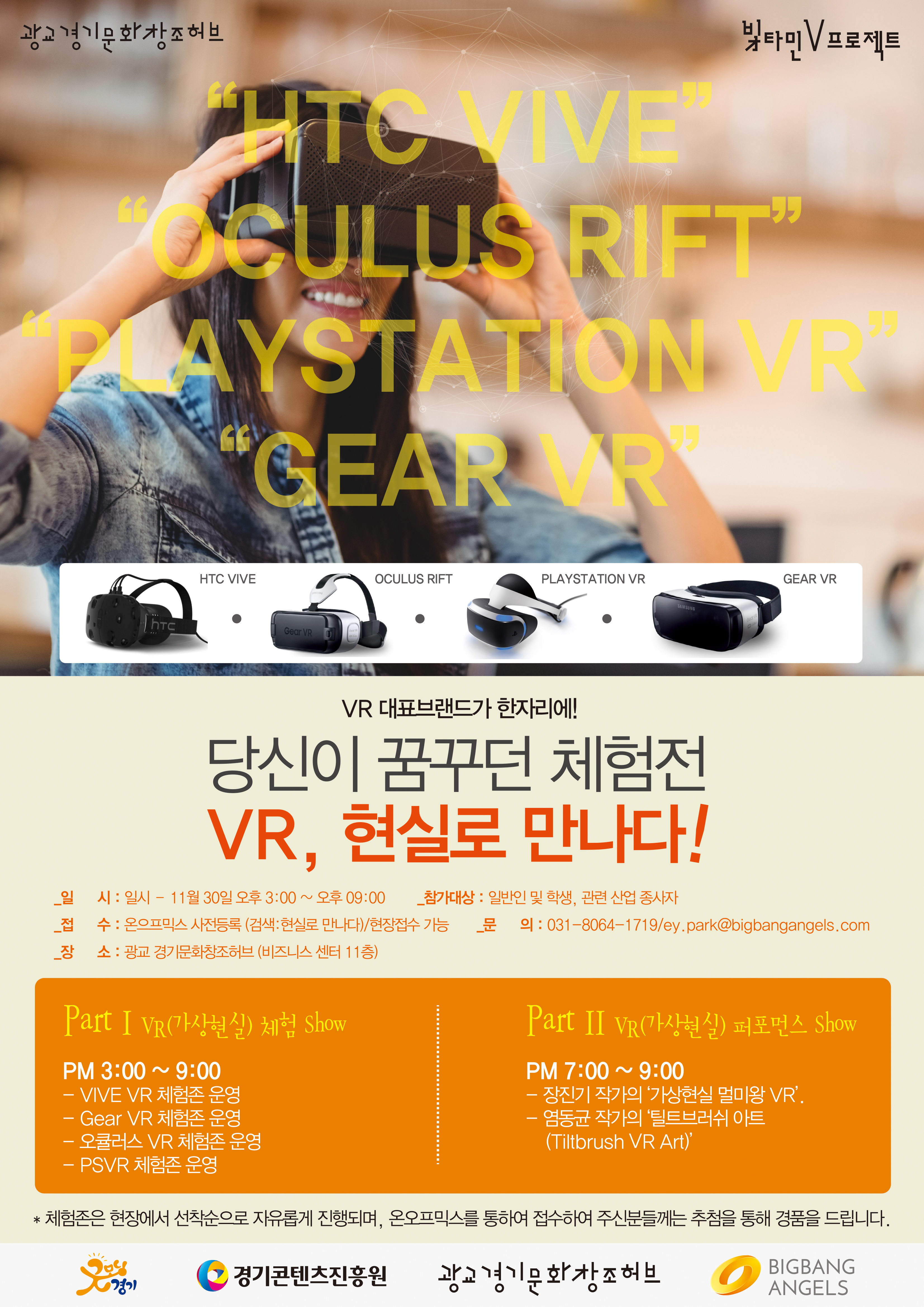 이번 행사는 다양한 VR기기들의 즐거운 체험과 화려한 VR퍼포먼스 공연이 어우러진 광교 경기문화창조허브 컨퍼런스 ‘문화, VR을 만나다’의 전야제로서 VR관련 산업 종사자 및 일반인을 대상으로 1부 VR 체험 Show와 2부 VR 퍼포먼스 Show로 진행된다.