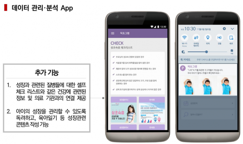 픽토그램은 자녀의 성장 정도를 통계 자료와 비교해 상위 퍼센트 수치 및 그래프를 제공한다. 또 기간별 성장 정도를 분석하여 성장 이상 징후를 체크할 수 있으며 성장에 영향을 미치는 영양, 수면, 운동 관련 정보들을 전달한다. 이러한 과정에서 아이에게 의학적인 문제가 발생했다고 판단됐을 시에는 관련 의료기관을 연계를 해주는 역할도 한다. 부모의 데이터를 입력하면 유전에 의한 영향도 수치도 알 수 있다.