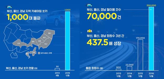 임영기 쏘카 사업본부장은 “쏘카는 국내 카셰어링 선도 업체로써 수도권과 부산 등 주요 대도시뿐만 아니라 중소도시로의 인프라 확대 및 서비스 품질 향상에 역량을 집중하고 있다”며 “차량 소유의 패러다임 전환과 공유경제 활성화를 위해 적극적인 홍보와 고객 만족을 위한 서비스 개선에 최선을 다하고 있다”고 말했다.