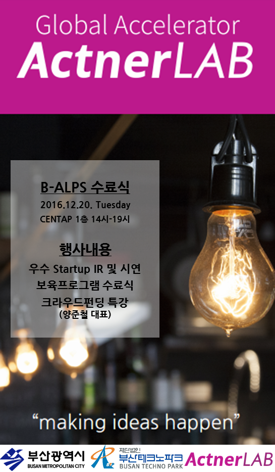 이번 행사는 B-ALPS에 참가한 47개 스타트업의 수료식, 우수 스타트업 데모데이, 양준철 온오프믹스 대표의 크라우드 펀딩 특강 세션으로 구성되어 있다.