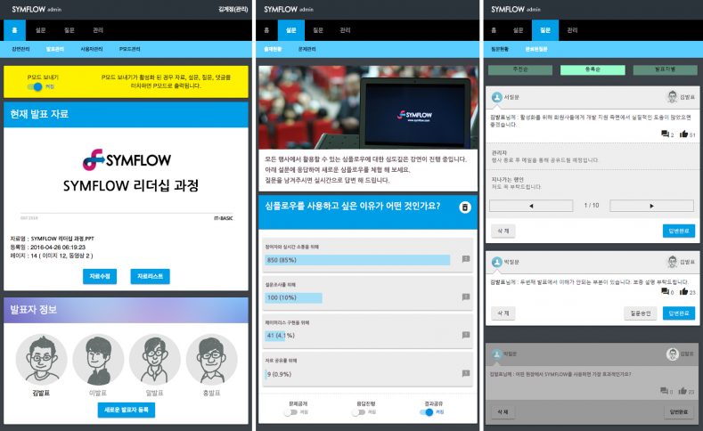 심플로우에 대해 민 대표는 “심플로우는 ‘심포니(Symphony)’의 ‘심(Sym)’ 과 ‘플로우(Flow)’의 합성어로서, ‘함께 공감하여 흐름을 만들어 가는 것’을 의미하는 웹 기반의 발표 시스템”이라고 설명한다. 심플로우의 핵심 기능은 ‘발표’와 ‘다운플로우’, 업플로우’ 3가지다. 파워포인트 등의 별도 프로그램 없이 브라우저만으로 발표를 진행할 수 있고, 발표자가 청중에게, 청중이 발표자에게 실시간을 질문을 던질 수 있다.