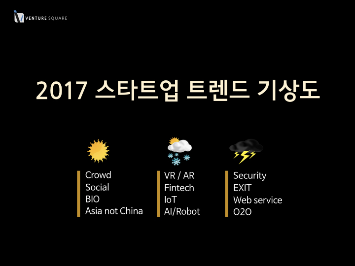 벤처스퀘어는 트렌드를 날씨에 비추어 전망하는 ‘스타트업이 주목할만한 2017년 트렌드 16’ 을 선정해 26일 발표했다.
