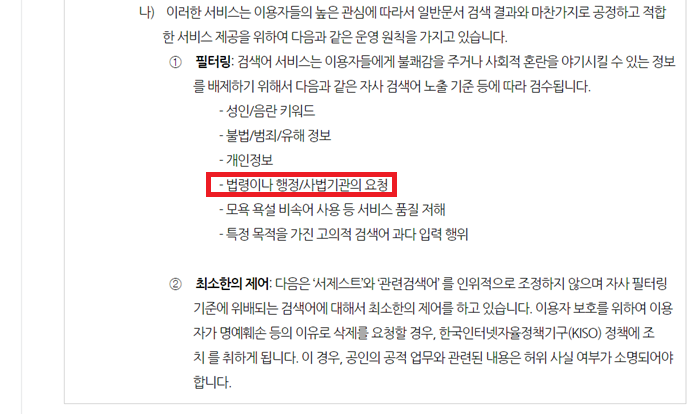 네이버와 다음이 ‘법령이나 행정/사법 기관의 요청이 있는 경우’ 특정 키워드를 삭제, 제외할 수 있는 지침이 있는 것으로 확인됐다.