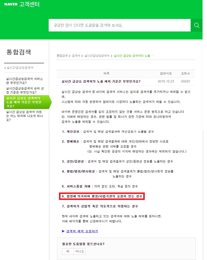 이에 관해 네이버는 “해당 규정은 한국인터넷자율정책기구(KISO) 승인을 받은 공개된 운영원칙이고, 법령에 따라 행정기관이 적법한 절차에 따라 삭제결정을 하거나 법원 판결문에 따라 삭제가 필요한 경우에 적용하기 위한 것”이라며 “표현을 보다 명확히 하기 위해 해당 문구를 수정했다”고 밝혔다.