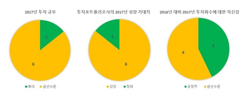 2016년 대비 2017년 투자회수에 대한 자신감은 투자자의 반 이상이 금년 수준으로 유지될 것으로 전망했다. 내년도 신규투자 자금 규모는 6곳이 올해와 같은 규모의 금액을 투자할 계획이라고 밝혔으며 한 곳은 투자를 더 많이 진행할 것이라 전했다.