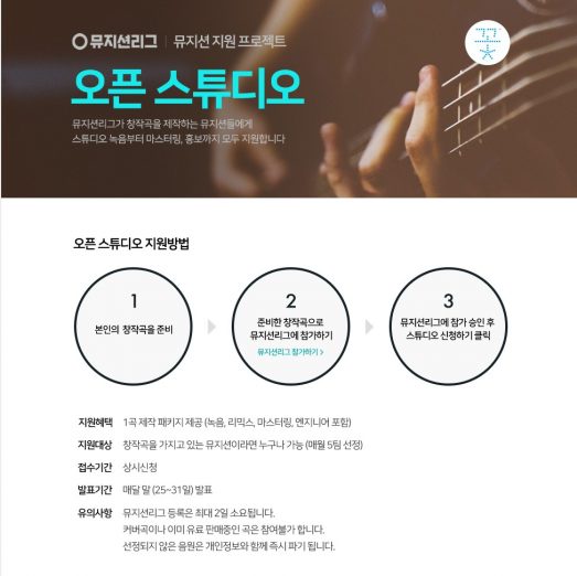 지원 대상은 네이버 ‘뮤지션리그’에서 활동하고 있는 뮤지션이며 참여를 원하는 뮤지션들은 뮤지션리그 ‘오픈스튜디오’ 신청페이지를 통해 자신의 곡을 업로드 하면 된다.