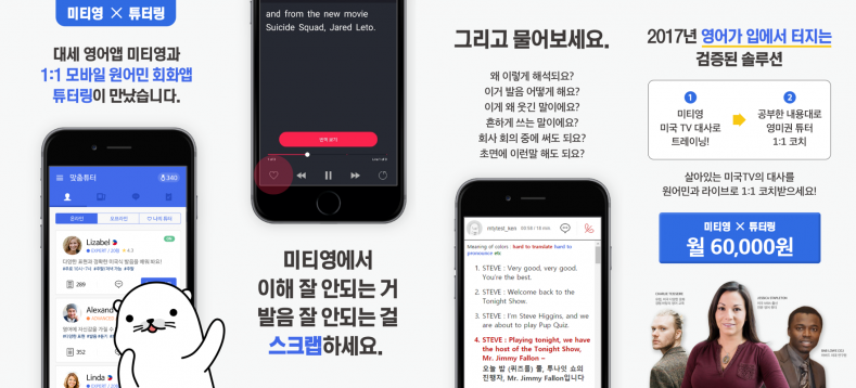 미국TV 방송으로 영어를 공부하는 앱 미티영이 외국인 1:1 회화 서비스 “튜터링“과의 제휴를 통해 신규 학습 서비스를 출시했다고 9일 밝혔다. 이 서비스는 미국TV방송 대사를 공부한 후 원어민에게 15분간 내용을 설명하고 코칭받는 방식이다.