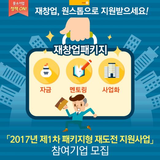 중소기업청과 미래창조과학부가 2017년 패키지형 재도전 지원사업에 참여할 기업을 2월 9일(목)까지 모집한다.