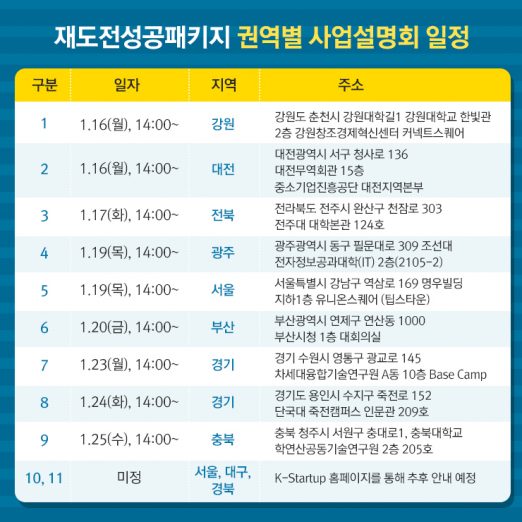 이번달 16일부터는 재도전성공패키지 권역별 사업설명회가 열릴 예정이다. 참여를 희망하는 (예비)재창업자는 K-스타트업및 재도전종합지원센터를 통해 신청하면된다.