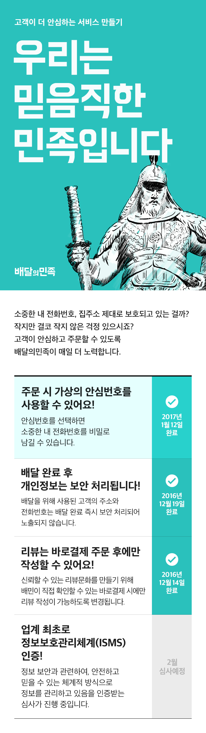 이외에도 배달의민족은 배달음식 시장 전반의 인식을 개선하고 환경과 문화를 지속적으로 개선하기 위해 ▶신뢰할 수 있는 리뷰 ▶보호받는 이용자 정보 ▶믿을 수 있는 먹거리 등 크게 3가지 주제로 이뤄진 ‘우리는 믿음직한 민족입니다’ 캠페인을 연중 상시적으로 벌여나가고 있다.