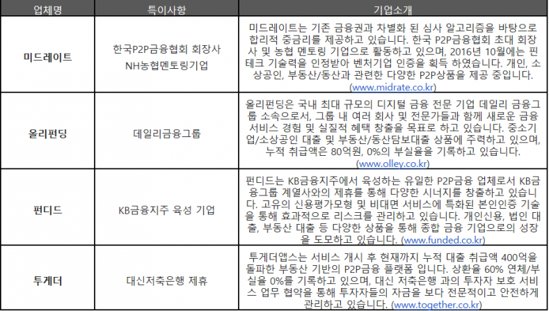이번 투자자 모집은 총 4억원 규모의 기간 12개월, 연 14% 수익률, 만기일시상환 조건으로 진행되며, 4개사가 각각 1억원씩 투자금을 모집하는 형태로 공동 심사를 통해 더욱 더 안전한 상품을 고객들에게 제공하게 된다.