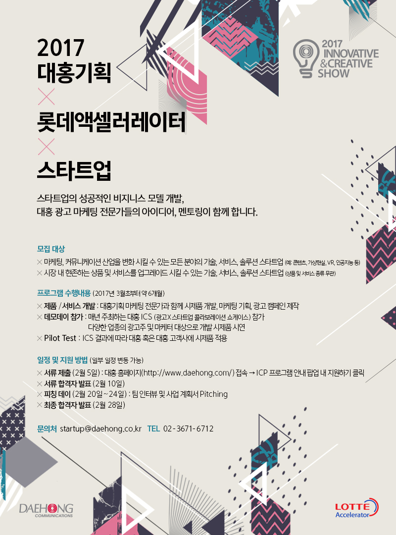 참여 업체는 대홍기획과 롯데그룹의 창업보육 전문법인 롯데액셀러레이터가 공동으로 선발하며, 6개월간의 개발 기간을 거쳐 올 하반기 ‘롯데 이노베이티브 & 크리에이티브 쇼(LOTTE ICS)’에서 데모데이를 가질 예정이다. 이 과정에서 대홍기획은 제품∙서비스 개발을 위한 전문가 멘토링, 직접투자를 포함한 투자유치와 사업제휴, 마케팅∙홍보 등을 지원한다. 참가를 희망하는 스타트업은 대홍기획 홈페이지를 통해 신청서를 작성하면 된다.
