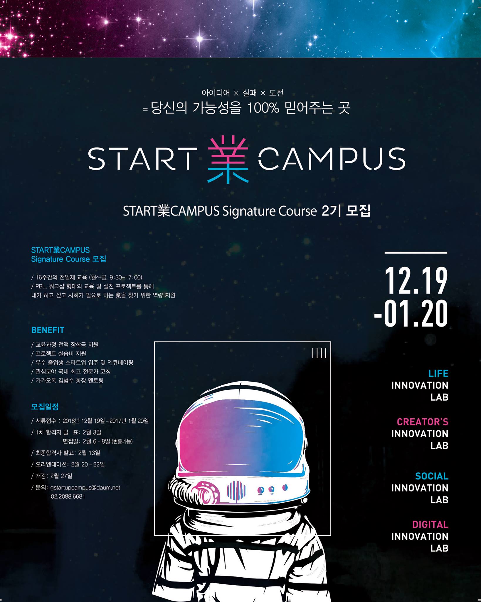 해당 코스는 4개의 이노베이션 랩(Digital, Life, Social, Creator’s)으로 구분하여 모집하고 있어 개인의 관심도와 역량에 따라 분야를 선택 지원 할 수 있다.