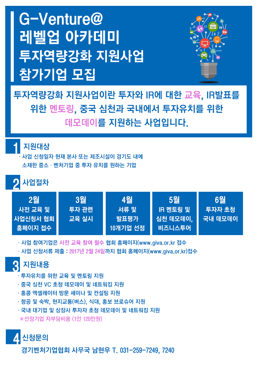 경기벤처기업협회가 투자 유치를 희망하는 경기도 소재 스타트업을 다음달 24일(금)까지 모집한다.이번 ‘2017년 G-Venture@레벨업 아카데미 – 투자역량강화 지원사업’은 경기도 내 유망 스타트업을 중국 심천 및 홍콩, 국내에 홍보 및 투자를 유치하고자 마련됐으며, 선발된 기업은 5월 말에 중국 심천 및 홍콩에 파견된다.