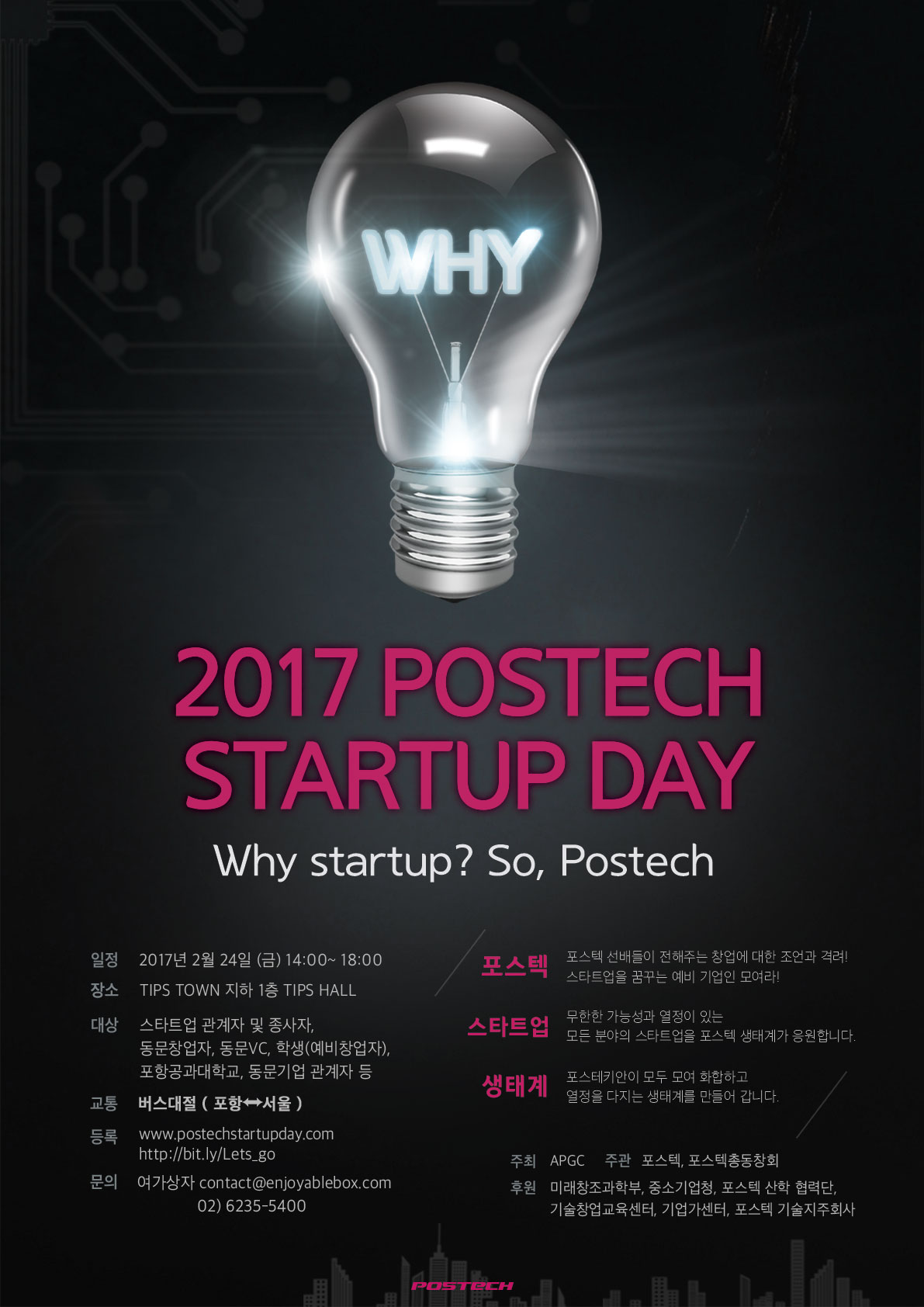 APGC가 주최하고 포스텍과 포스텍 총동창회가 주관하는 2017 포스텍 스타트업 데이는 포스텍의 스타트업 생태계 브랜딩 및 활성화를 목적으로 열리는 네트워킹 행사다.