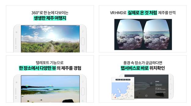 제주 여행객들은 제주투어 360 앱을 통해 까페, 해변, 명소, 호텔 등의 여행지를 360도 VR 콘텐츠로 사전에 확인할 수 있으며 텔레포트 기능을 이용해 한 장소에서 다양한 각도의 제주 경치를 볼 수 있다.