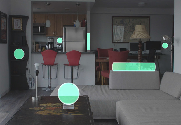 이 제품은 이렇듯 공간 전체를 스위치로 바꿔 리모컨 없이 모든 가전 제품을 원격 조작할 수 있다는 컨셉트를 내세운다. AR(Augmented Reality), 증강현실 기술을 곁들인 것.