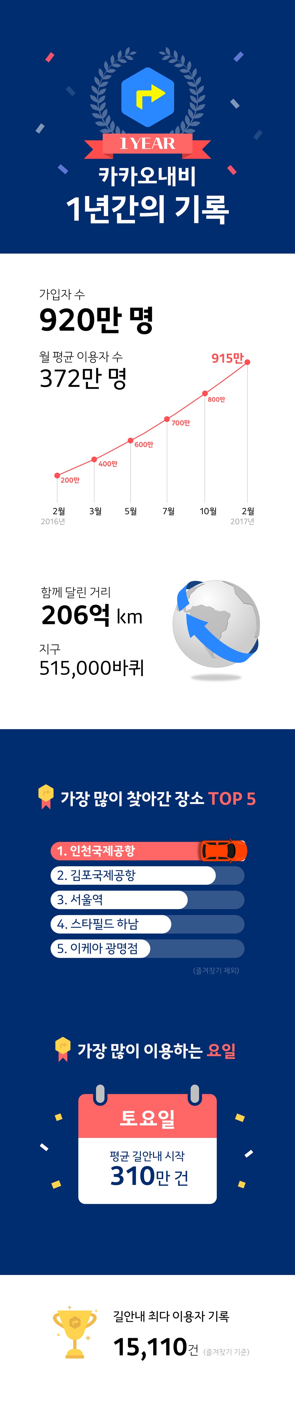 카카오내비의 본격적인 기록 잔치는 지금부터다. 지금까지 카카오내비 이용자가 길 안내를 실행한 횟수는 총 7.3억번에 달한다. 카카오내비를 이용해 달린 거리는 206억km로 지구를 약 51만5000번 돌 수 있는 거리다.