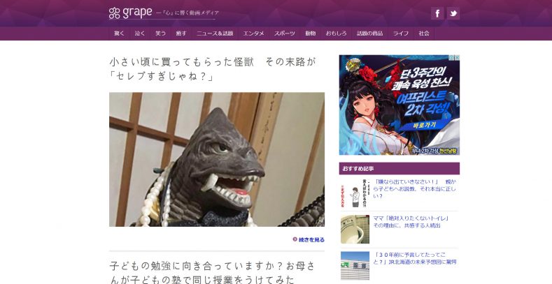 그레이프(Grape)는 앞서 소개한 쿠레이지와 유사한 스낵 콘텐츠 미디어다. 웃음, 힐링, 가십, 스포츠, 동물, 화제성 상품 등 이용자의 관심을 끌 수 있는 모든 콘텐츠를 제공한다. 전문 에디터가 상주하며 직접 콘텐츠를 생산하고 있는 점도 특징이다.
