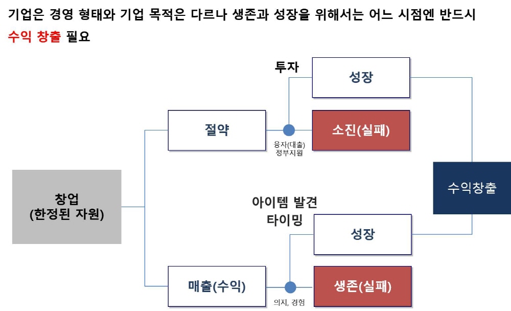 매출도 마찬가지다. 매출 발생은 아이템 발견 타이밍이 중요할 수 있는데 의지나 경험 그 중에서도 스타트업이라면 CEO의 역량이 좌우하는 부분이 클 수 있다. 이 역시 적절한 타이밍을 만나지 못하면 기업은 성장 혹은 생존 실패라는 상반된 결과를 만난다. 이런 스타트업의 성장 과정이 가는 최종 목적지는 어느 시점이 될지와 관계없이 수익 창출이 될 것이다.