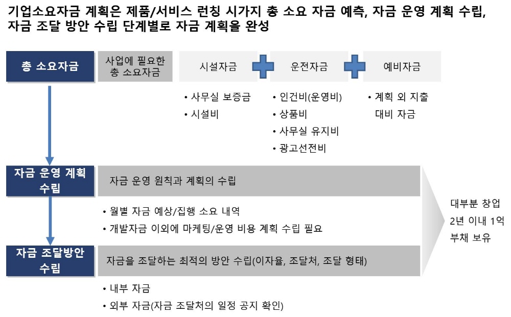 마지막은 자금 조달 방안 수립이다. 자금을 조달하는 최적의 방안을 수립해야 하는데 이자율과 조달처, 조달 형태 등을 고려해야 한다. 이런 자금 조달처는 크게 보면 내부 자금과 외부 자금으로 나눌 수 있다. 외부 자금이라면 자금 조달처의 일정이나 공지를 미리 확인할 필요가 있다. 자금 운영 계획과 자금 조달 방안을 수립하는 건 스타트업 기업에겐 중요하다. 스타트업 대부분이 창업 2년 안에 1억 가량 부채를 품게 되기 때문이다.