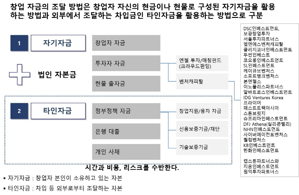 창업자 본인이 소유하고 있는 자본인 자기자금은 창업자 자금 외에 엔젤 투자나 매칭 펀드, 벤처캐피탈 등을 통한 투자자 자금, 현물 출자금 등을 포함한다. 타인 자금이란 창업 지원이나 융자 자금 혹은 신용보증기금이나 재단, 기술보증기금 등을 통한 정부정책자금을 의미한다. 여기에 은행 대출, 개인 사채 등도 예가 될 수 있다. 물론 타인자금이란 지금을 유치하기 위한 시간과 비용, 리스크를 수반한다는 점은 명심할 필요가 있다.