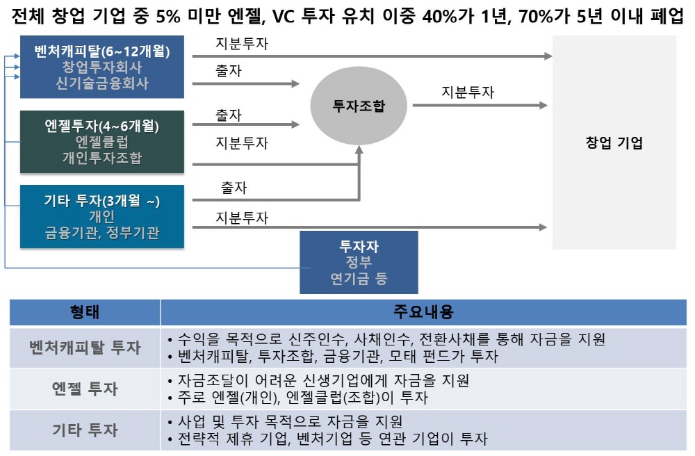 이유는 이렇다. 전체 창업 기업 가운데 5% 미만이 엔젤이나 벤처캐피탈 투자 유치를 하고, 그 기업 중 40%는 1년, 70%는 5년 안에 폐업하거나 전업한다. 스타트업이 가장 선호하는 벤처캐피탈 투자는 수익을 목적으로 신주 인수나 사채 인수, 전환 사채 등의 방법을 통해 자금을 지원한다. 엔젤 투자는 자금 조달이 어려운 스타트업에게 자금을 지원하는 것으로 주로 엔젤, 그러니까 개인이나 조합 형태인 엔젤 클럽이 투자를 하게 된다. 물론 그 밖에도 사업이나 투자 목적으로 자금을 지원하거나 전략적 제휴 기업 혹은 벤처기업 등 사업 연관 기업이 투자를 하기도 한다.