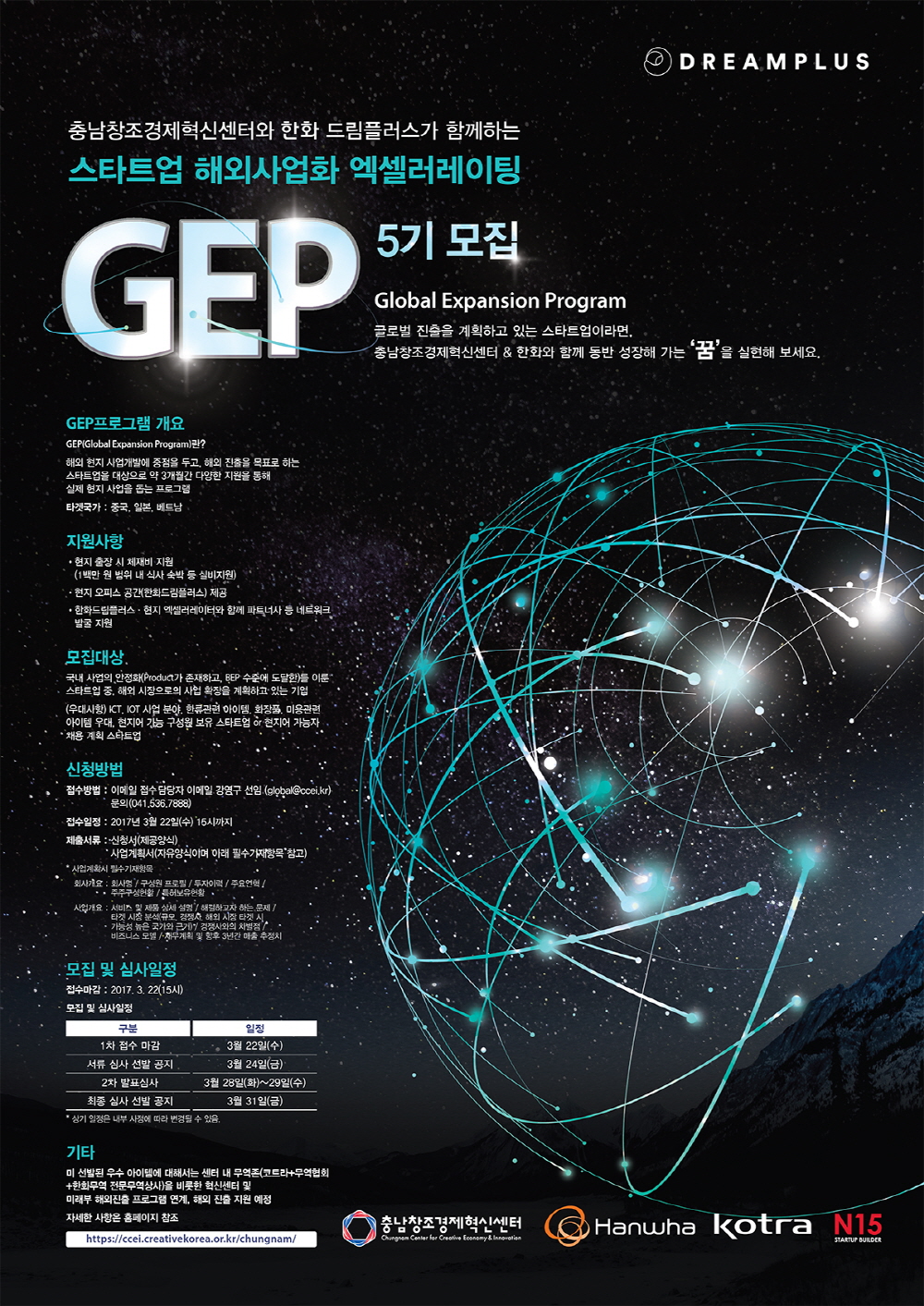 GEP 프로그램에 신청하려면 3월 22일까지 신청서와 사업계획서를 이메일로 접수하면 된다. 또 1차 선정 기업은 영문 자료를 준비해야 한다. 1차 서류심사 선발 결과는 3월 24일 충남창조경제혁신센터 홈페이지를 통해 공지할 예정이다. 관련 내용은 이곳에서 확인할 수 있다.