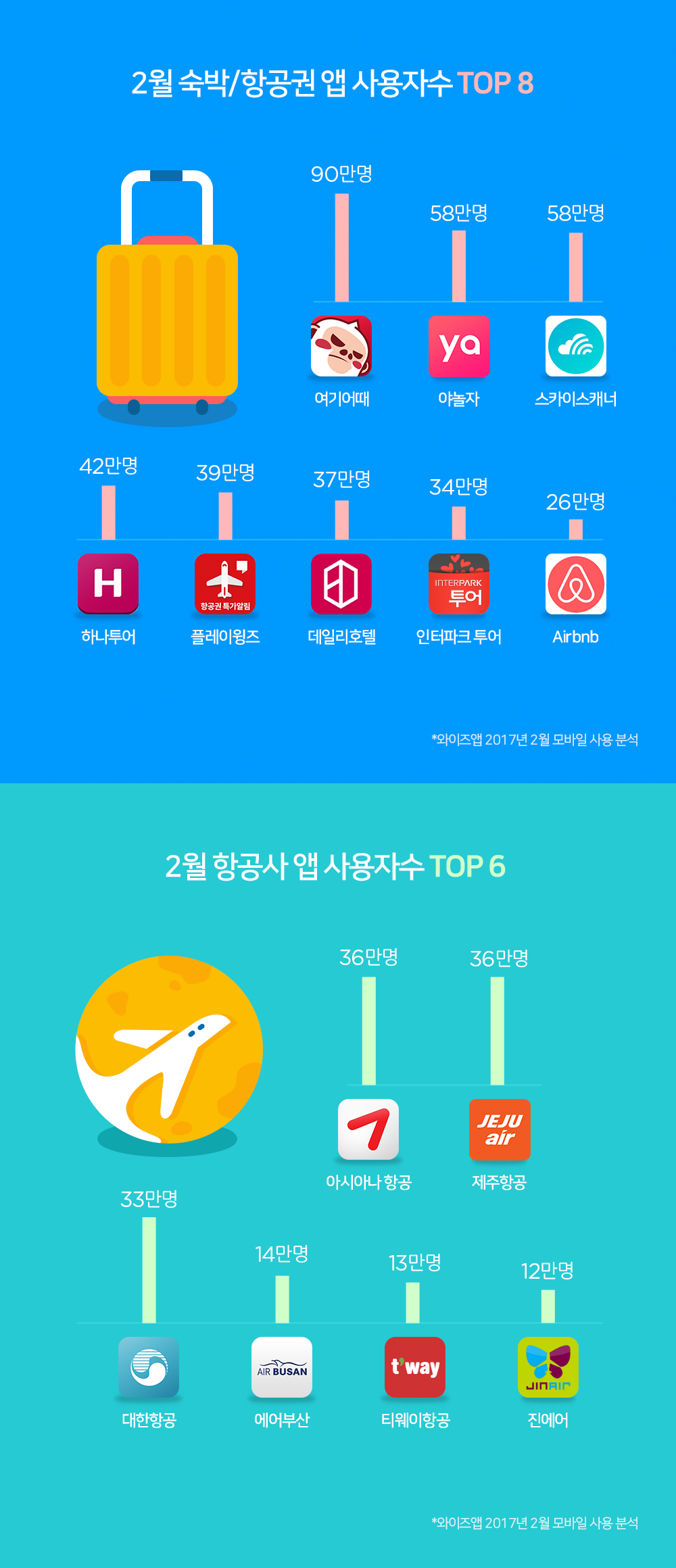 또 항공사 앱 사용자 순위를 보면 1위는 36만 명을 기록한 아시아나항공이며 2위는 제주항공(36만 명), 3위는 대한항공(33만 명), 4위는 에어부산(14만 명) 순이다. 숙박/항공권 앱 전체 순위에는 앞서 소개한 업체 외에 플레이윙즈, 데일리호텔, 인터파크투어 등이 이름을 올렸다. 이번 조사 결과는 지난 2월 한 달 동안 안드로이드 스마트폰 사용자 2만 6,898명을 대상으로 실시한 것이며 95% 신뢰수준에서 오차범위 ±0.6%다.
