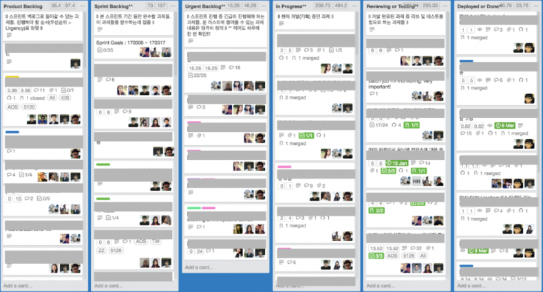 ◇ 요구사항 개발과 확인=제품팀에 요구사항을 제기한 사람은 본인이 요청한 사항이 어떻게 진행되고 있는지 항상 확인할 수 있다. 개발팀 스크럼보드는 개발팀 뿐 아니라 모두에게 공개되어 있다. 스크럼보드는 트렐로(Trello)를 통해 관리한다. 카드마다 구체적 내용을 담을 수 있어 카드를 통해 얼마든지 논의할 수 있다. 개발 중인 내용은 카드를 통해 진척사항을 기록하고 PM이나 요구사항 발주자 역시 개발 사항에 대한 질문을 요구할 수 있다. 큰 틀에서 벗어나지 않는다면 요구사항 변화는 이 카드를 통해 적응할 수 있다.