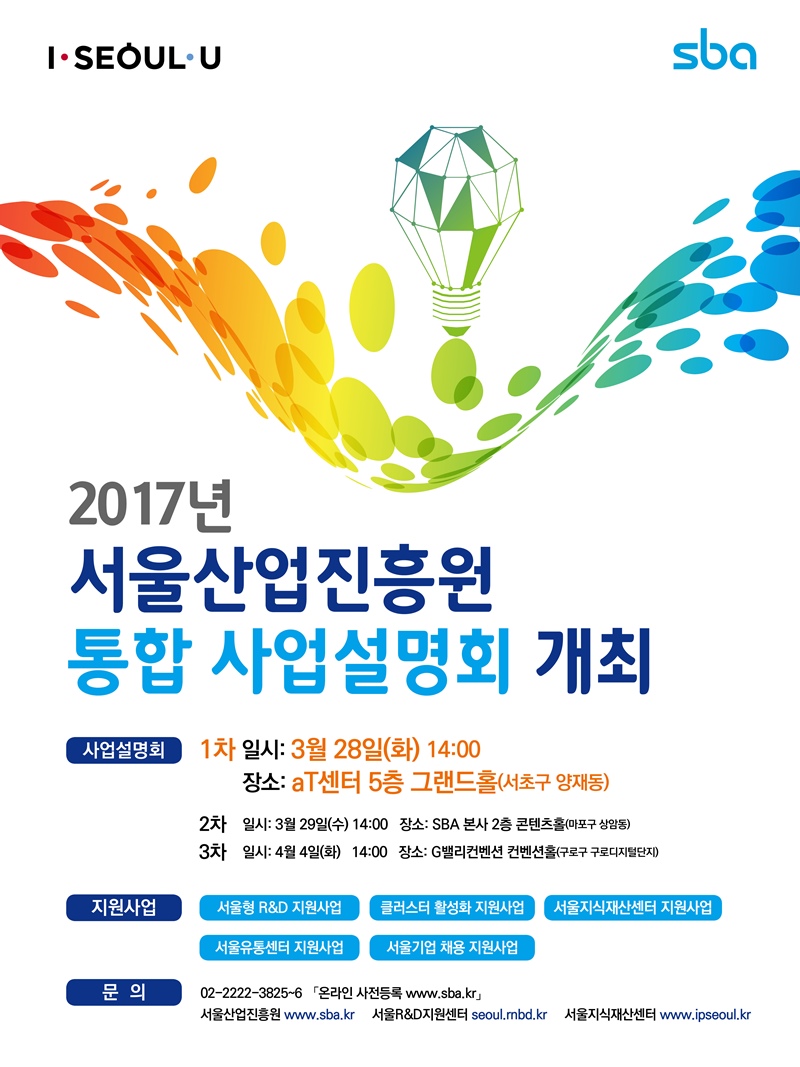 서울산업진흥원과 서울시는 오는 3월 28일(화) 양재 aT센터에서 2017년도 통합설명회를 개최한다. 또 기업 접근성을 위해 29일에는 상암, 4월 4일에는 G밸리에서 순차적으로 진행한다. 설명회에서는 서울형 R&D 지원방향뿐만 아니라 클러스터, 유통 등 SBA의 다양한 지원사업도 함께 안내할 예정이다.