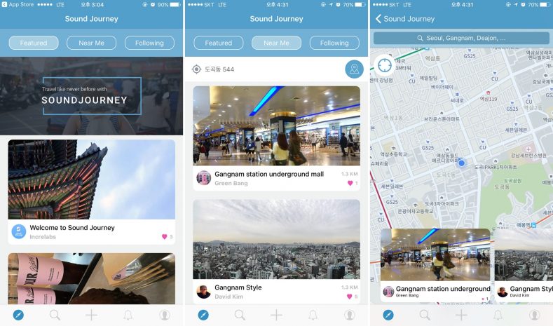 사운드저니는 현재 iOS에서만 사용 가능하다. 앱스토어에서 앱을 내려받아 개인 계정을 만들고 나면 준비 완료. 첫 화면에는 피쳐드 이미지가 뜬다. 피쳐드에는 사운드저니가 선택한 장소가 노출된다. ‘NEAR ME’ 메뉴를 클릭하면 현재 위치에서 가까운 명소나 카페, 식당 등 관련 오디오 가이드가 자동 노출된다. 사진을 클릭하고 들어가면 누군가가 녹음해 놓은 가이드를 들을 수 있다.