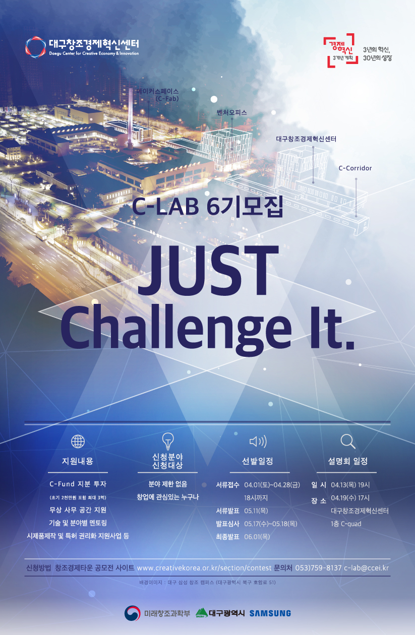 대구창조경제혁신센터는 유망 스타트업을 발굴하여 창업 과정을 지원하는 ‘C-LAB 6기 스타트업’ 참가팀을 모집한다.