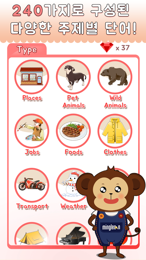 밍글콘! 농구 영단어240은 240가지에 이르는 다양한 주제별 단어를 지원하는 한편 스티커를 모으도록 유도하고 20등급으로 나뉜 레벨 설정 등 게임 요소를 곁들여 아이들이 자연스럽게 알아야 할 240개 영어 단어의 발음은 물론 문장까지 익힐 수 있게 해준다. 읽기와 말하기를 기반으로 한 농구 게임 등을 하면서 학습할 수 있다. 단어를 들고 농구공을 롤링하는 등 여러 단어 중에서 정답을 맞출 수 있게 재미를 주거나 영어 놀이 음향이나 반응을 곁들여 학습 효과를 높일 수 있게 설계했다. 모드도 연습과 챌린지, 하드 등에서 고를 수 있다.