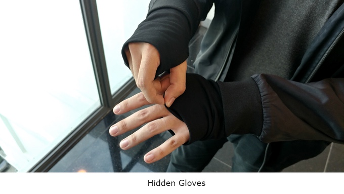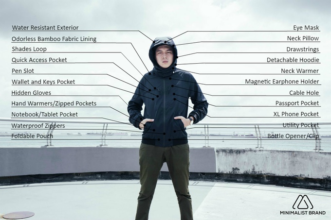 이제 핵심 기능인 주머니에 대한 부분이다. 이 재킷은 총 8가지 주머니를 내장하고 있다. 먼저 전화기 주머니는 아이폰 7 플러스처럼 큰 스마트폰도 충분히 들어갈 공간을 제공한다. 그리고 여권 주머니, 선글라스 주머니, 펜을 꽂고 지갑과 열쇠를 넣는 주머니, 재킷 안쪽에 두개의 큰 주머니에는 아이패드나 탈착한 후드를 넣을 필요한 충분한 공간이 있다. 마지막으로 양손을 따뜻하게 보호할 지퍼가 달린 호주머니가 있다고 제작자는 뻔뻔하게 소개하고 있다.